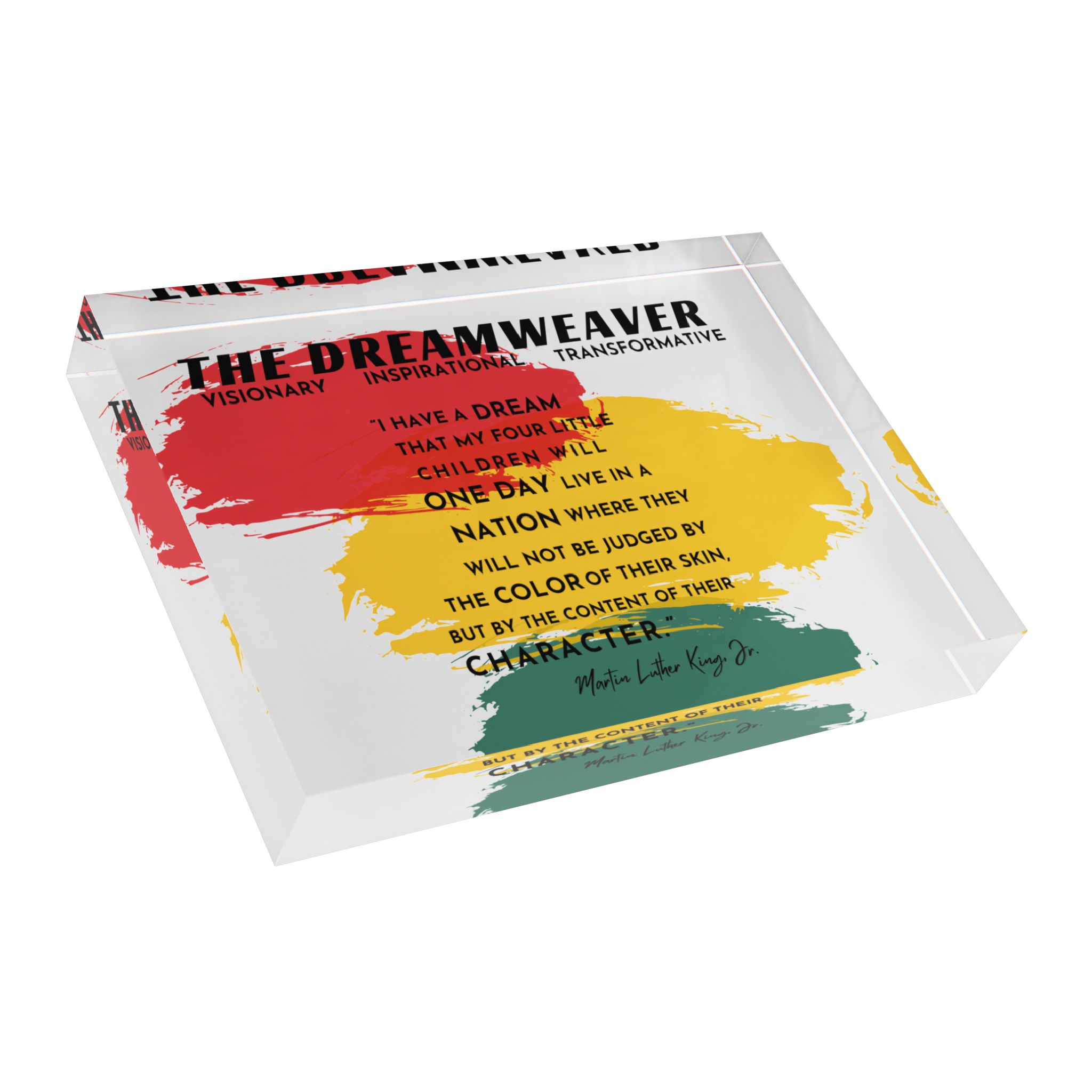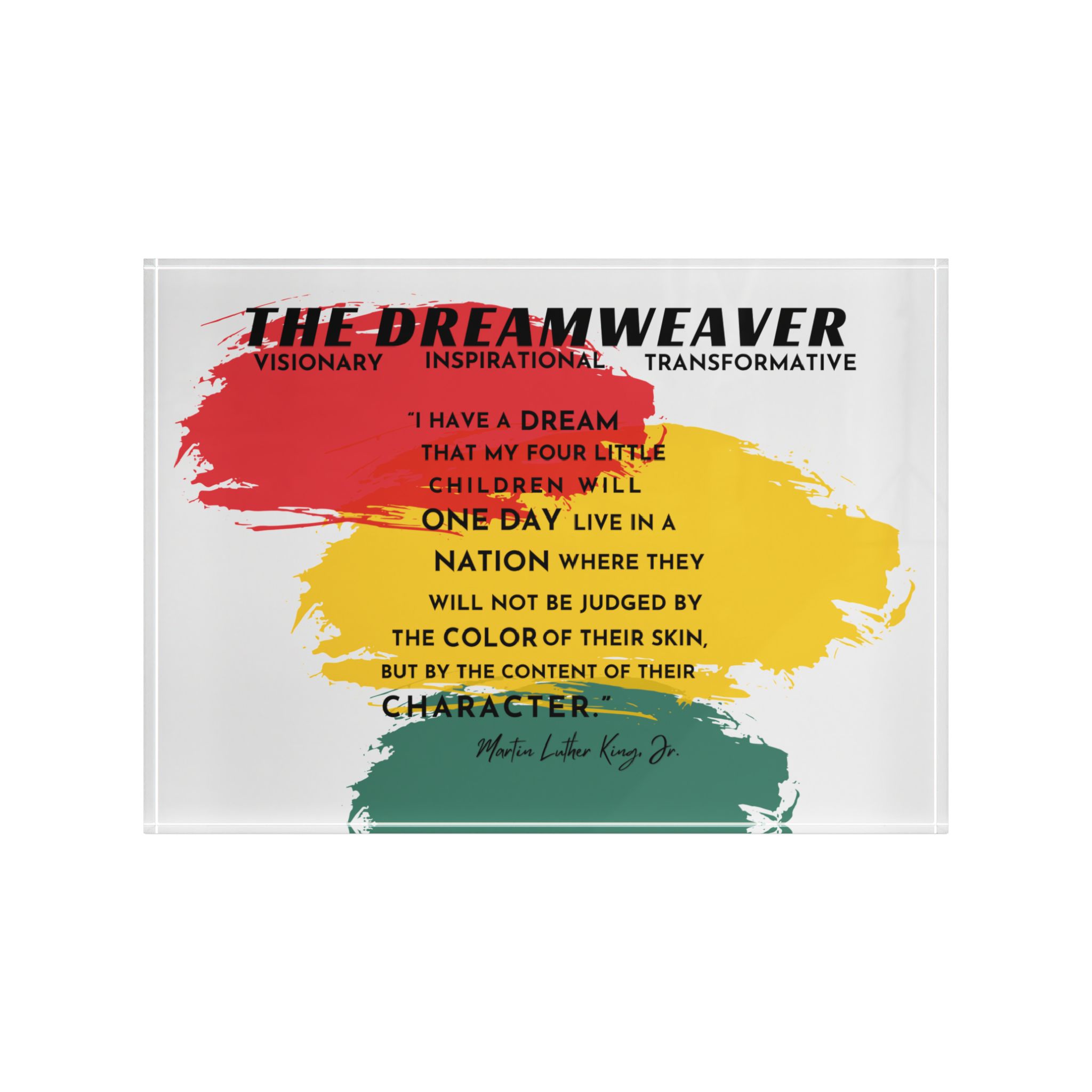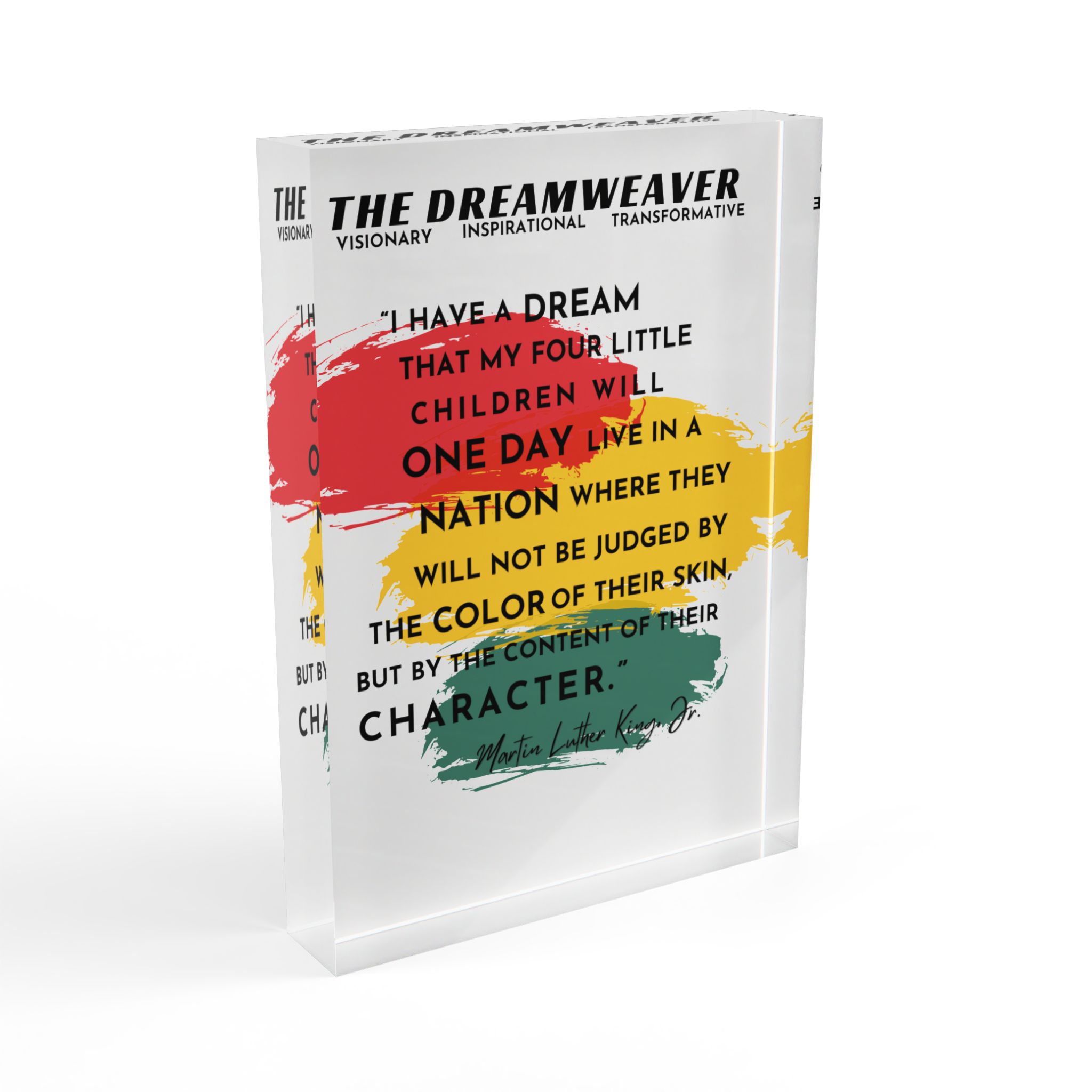 ABOUT THE DESIGN Elevate your home decor with this stunning Photo Block, part of a three-piece set celebrating the enduring legacy of Dr. Martin Luther King Jr. This poignant photo block features a powerful excerpt from Dr. Martin Luther King Jr.’s iconic “I Have a Dream” speech: “I have a dream that my four little…