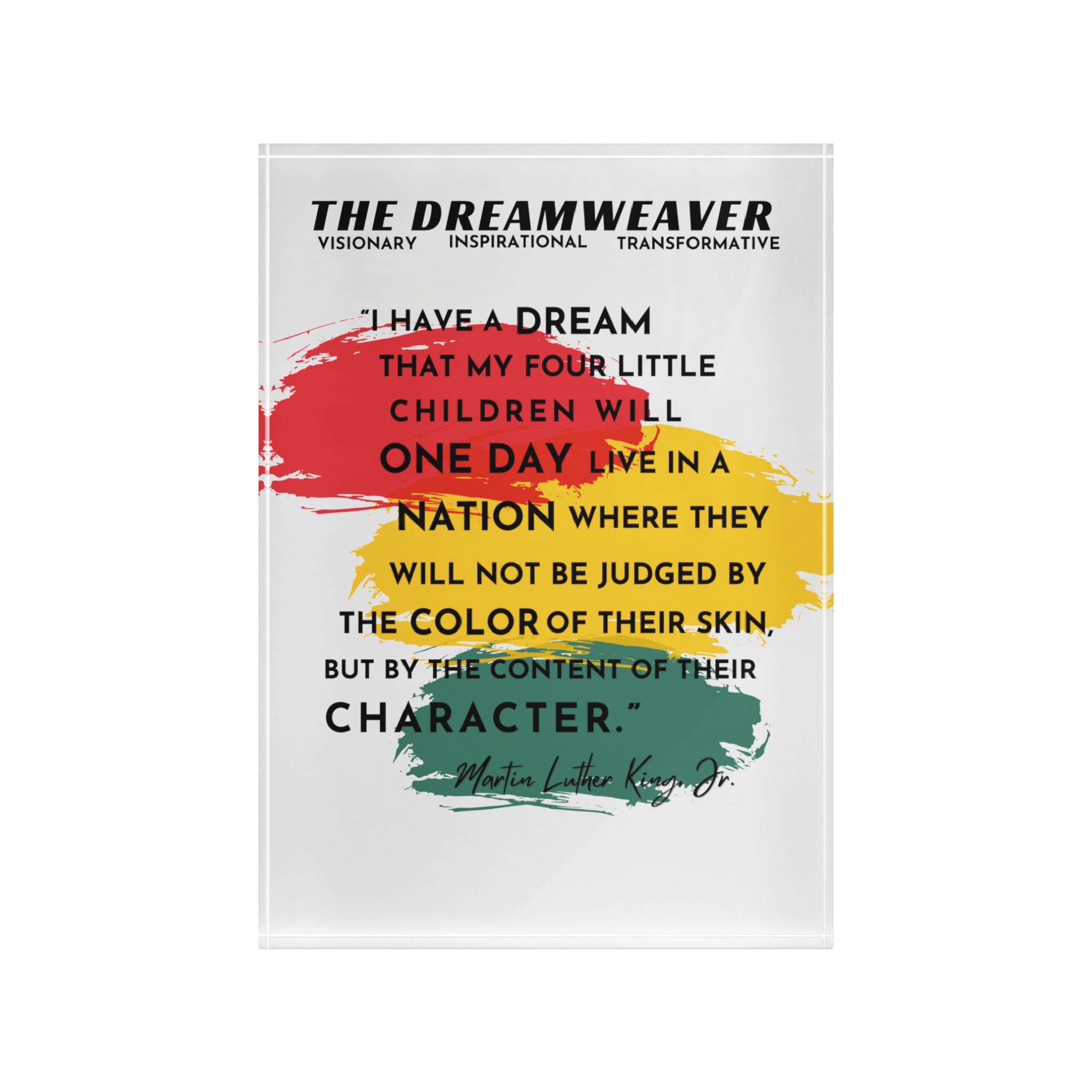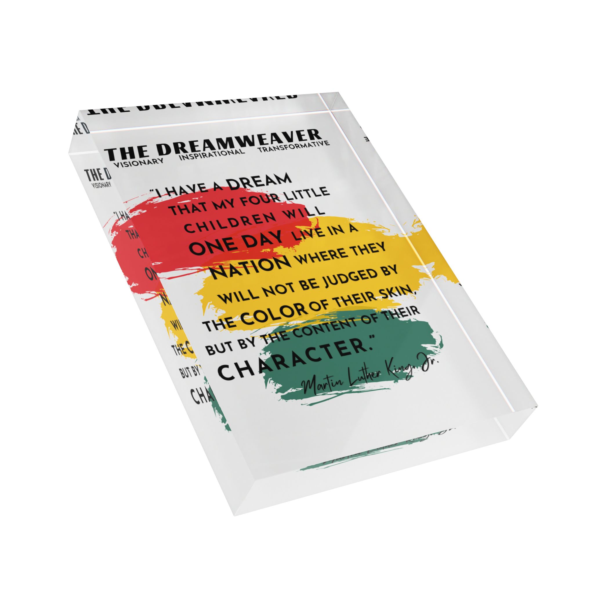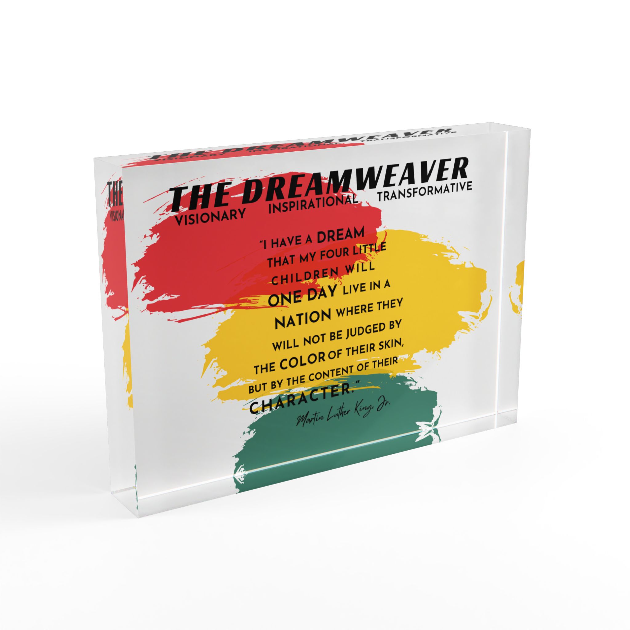 ABOUT THE DESIGN Elevate your home decor with this stunning Photo Block, part of a three-piece set celebrating the enduring legacy of Dr. Martin Luther King Jr. This poignant photo block features a powerful excerpt from Dr. Martin Luther King Jr.’s iconic “I Have a Dream” speech: “I have a dream that my four little…