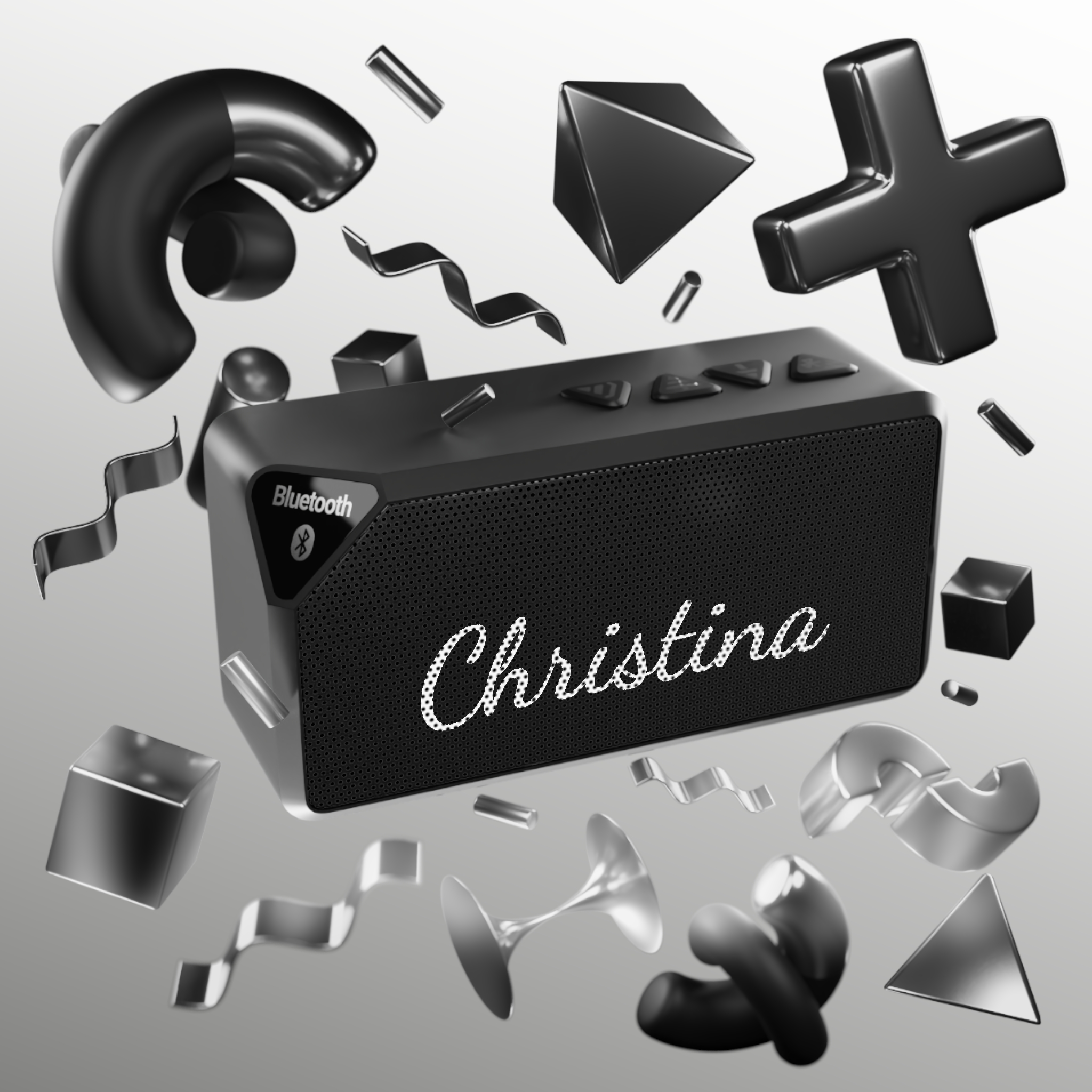 Compact, portable Bluetooth speaker with a clean matte ABS shell and a simple retro grille that can be personalized with a name.